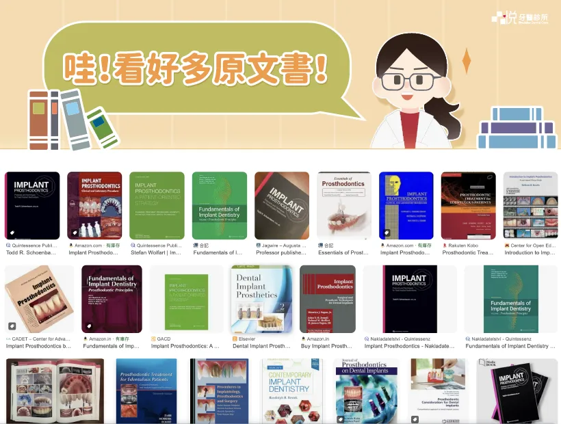 假牙材質方面,則有各種金屬、陶瓷等可以選擇,也造成價格上的差異。最後,植牙的咬合力量、外型設計⋯等等,其實有很多「眉角」,足以出好幾本原文書(如圖),醫師是否定期更新這些知識,也會成為影響價格的因素。