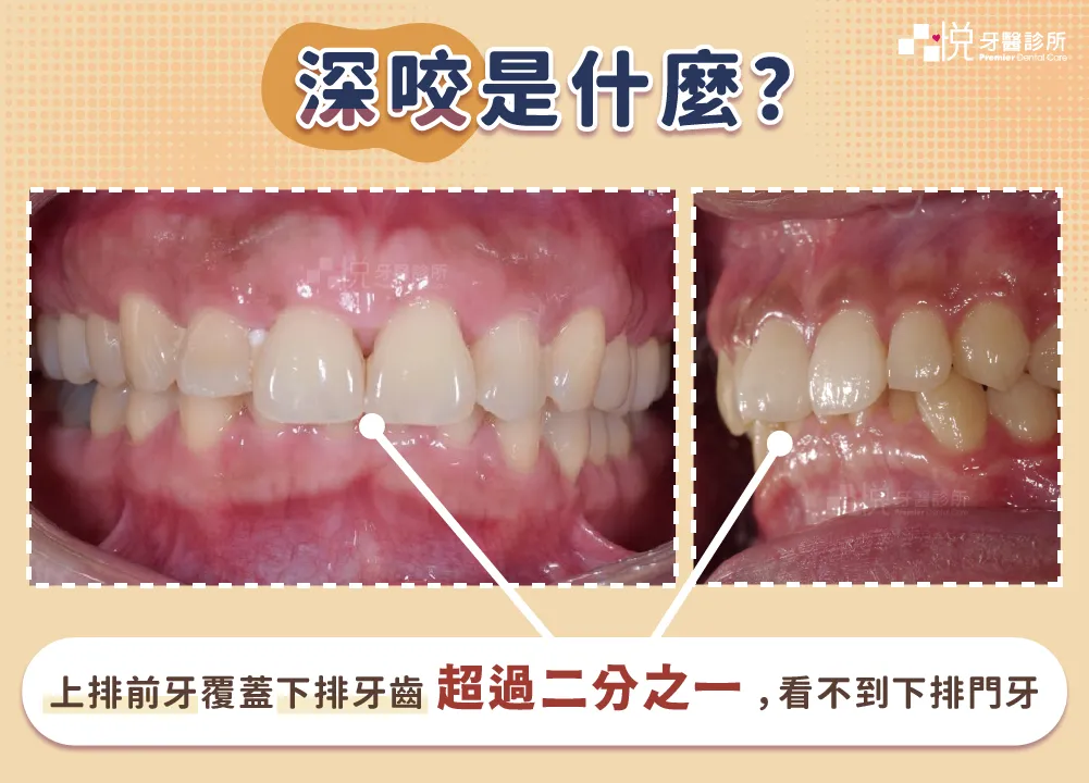 當上排前牙覆蓋下排牙齒超過二分之一甚至更多,讓下排門牙幾乎看不到,這種情況即可被定義為「深咬」。