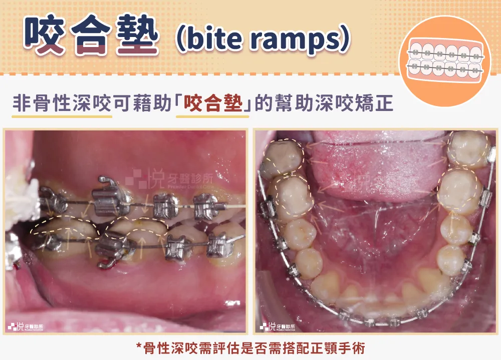 可以藉由咬合墊 (bite ramps) 或橡皮筋的裝置讓下顎打開咬合。如骨性的深咬需評估是否需搭配正顎手術。